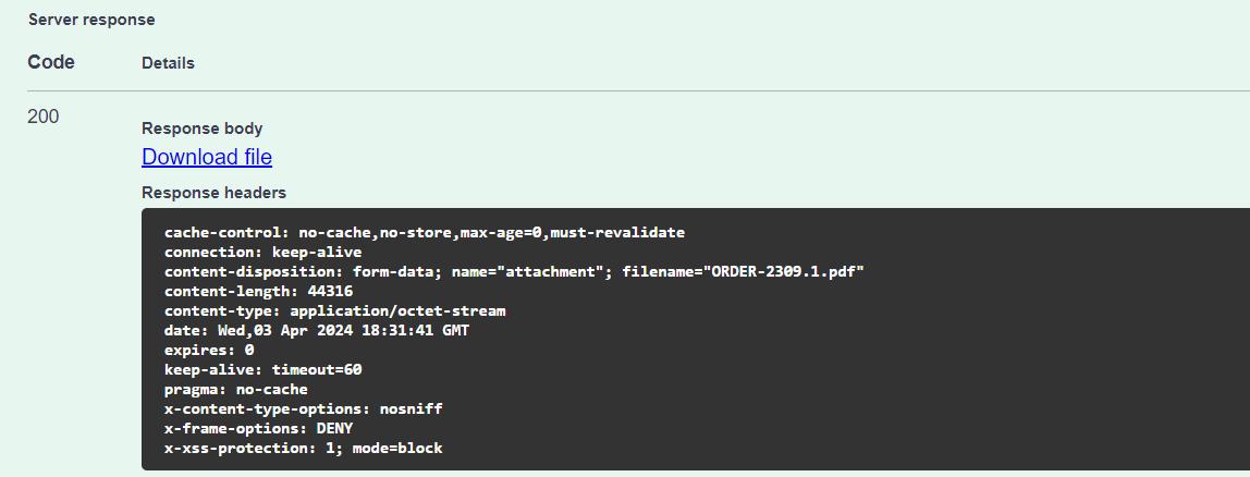 The name of the generated PDF file will be included in the response header under Content-Disposition It will appear as an attachment with a specific filename.
