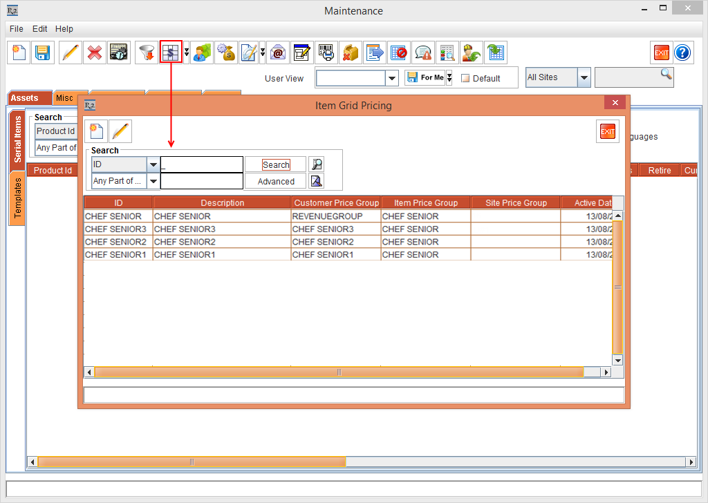 Select the Maintenance module > Grid Pricing icon. The Grid Pricing window is displayed. The defined Grid Pricing [CHEF SENIOR], [CHEF SENIOR1], [CHEF SENIOR2], and [CHEFSENIOR3] is displayed, as shown in Figure 1.0.