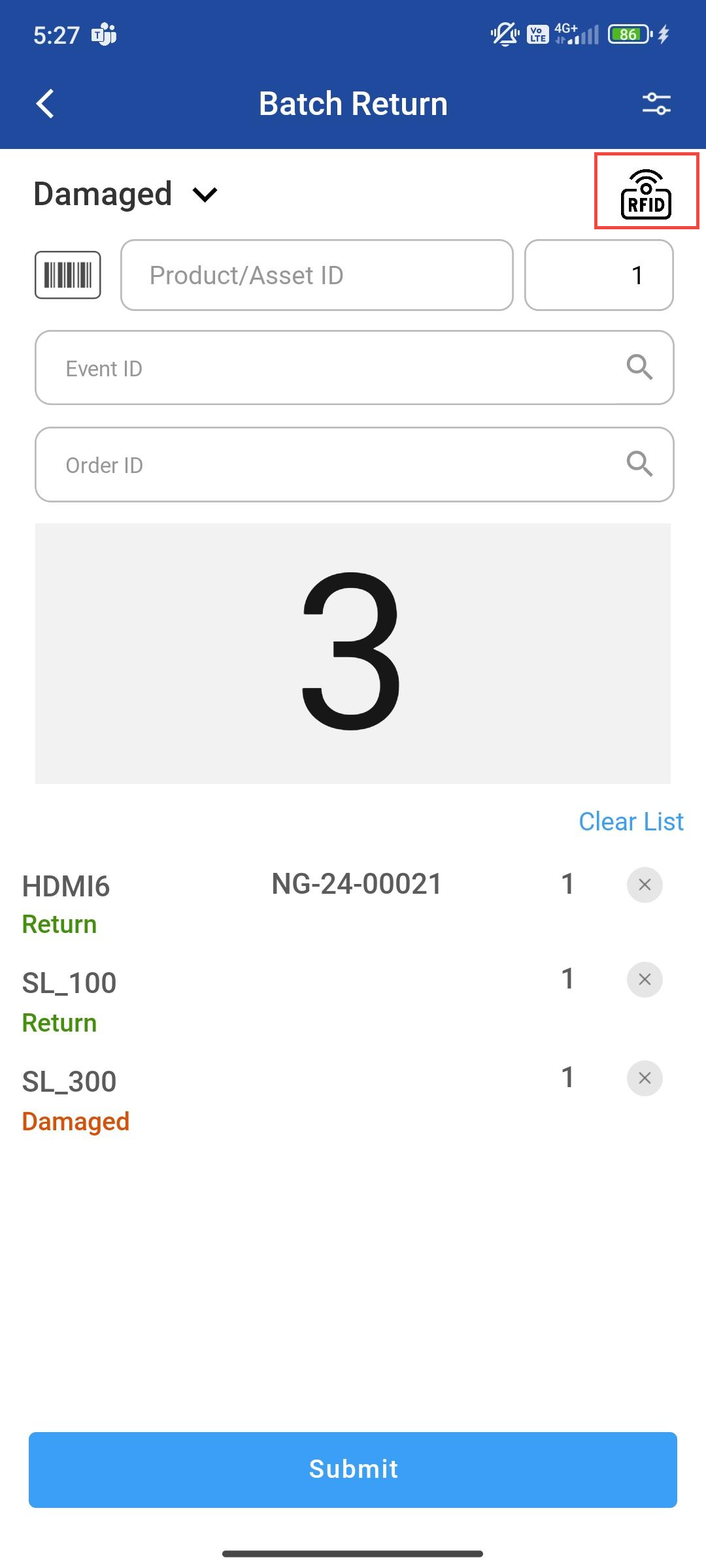 1. You can scan items or Enter Order/Event ID manually and click Submit.