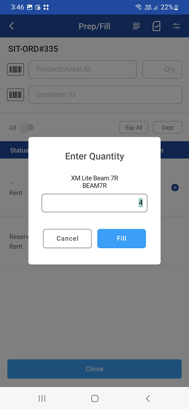 Scenario 1: When you scan a product/asset id then item adds with Filled Qty.