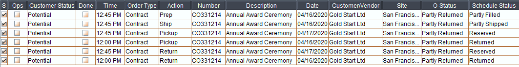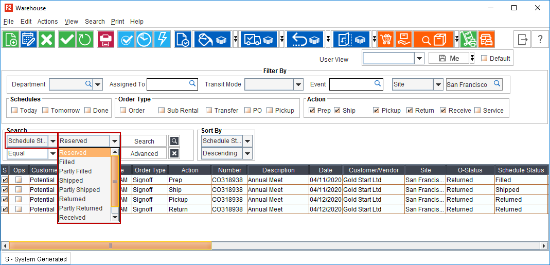 "Schedule Status" generated for Rental Orders/Sale Orders/Operation Orders can be viewed from Warehouse module > Schedule Search grid.