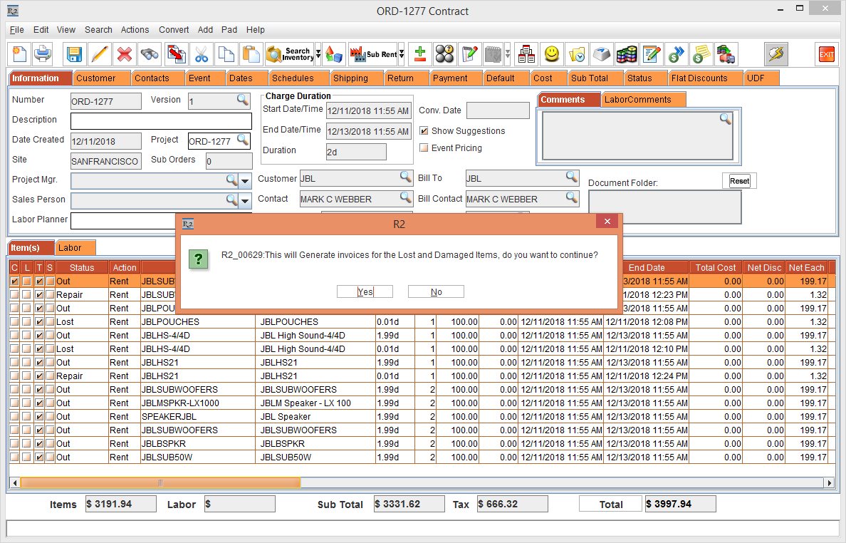 The system displays a prompt with the message "R2_00629: This will Generate invoices for the Lost and Damaged Items, do you want to continue?" with Yes and No buttons.