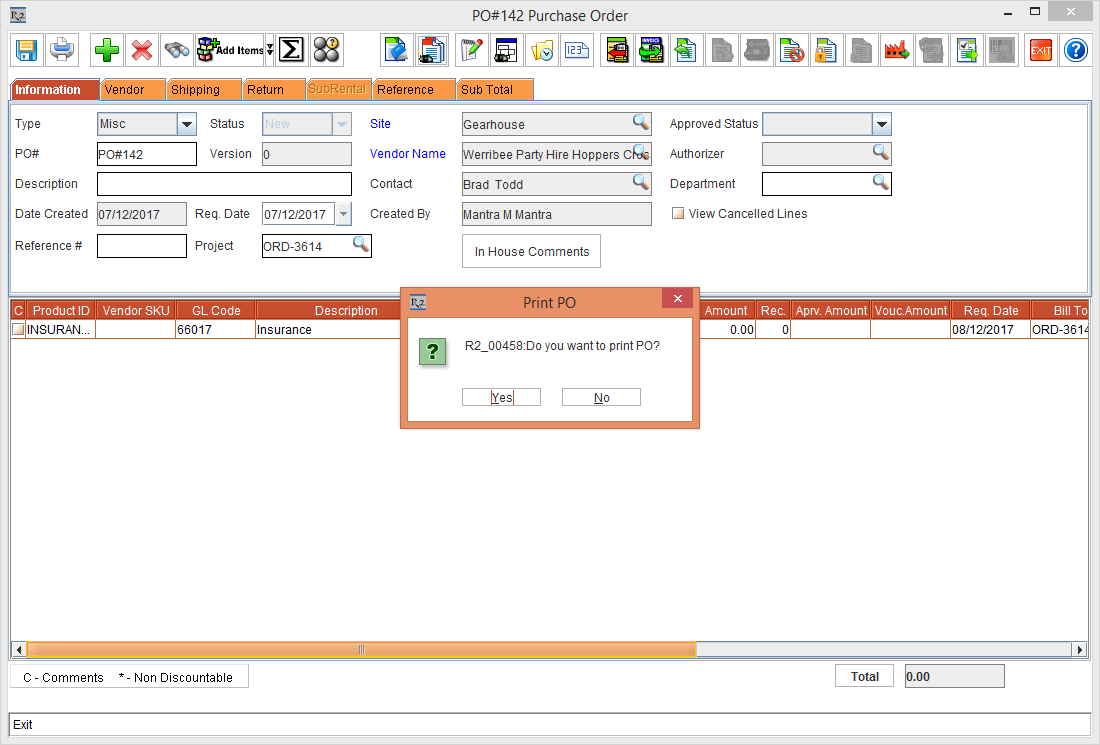 The system display the message "Do you want to Print PO?", as shown in Figure 1.5.