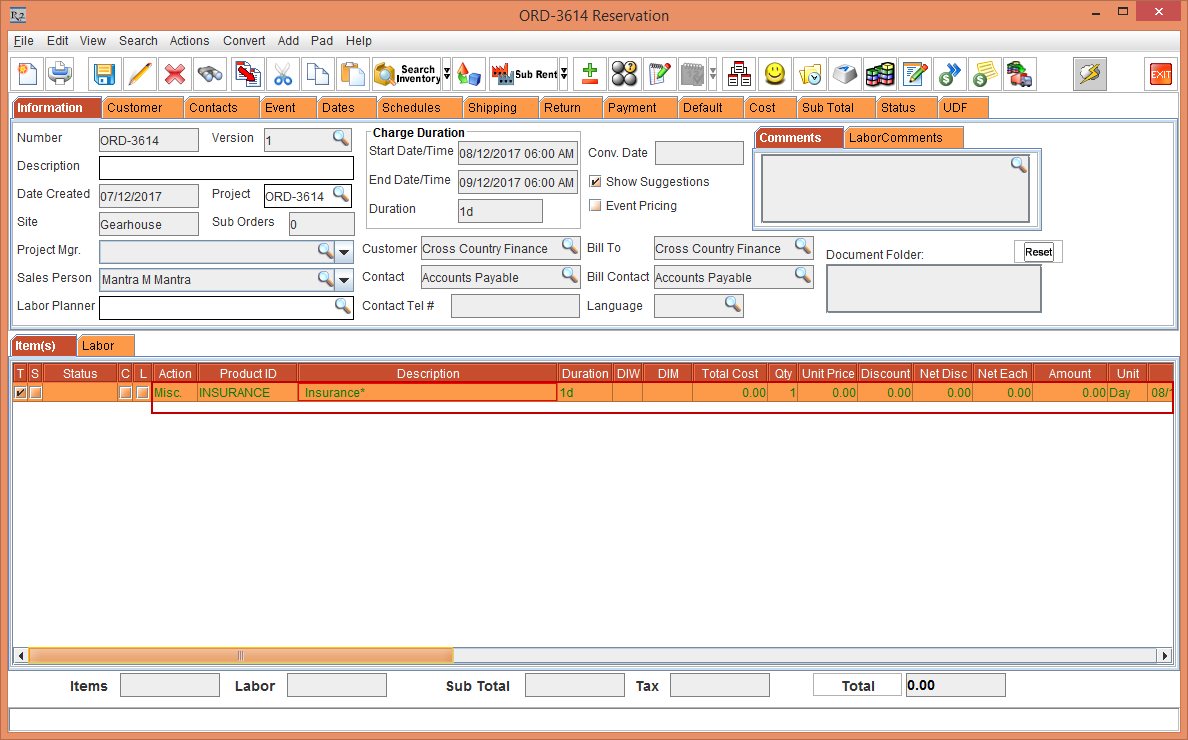Figure 1.0 Order with Misc Charge [INSURANCE]