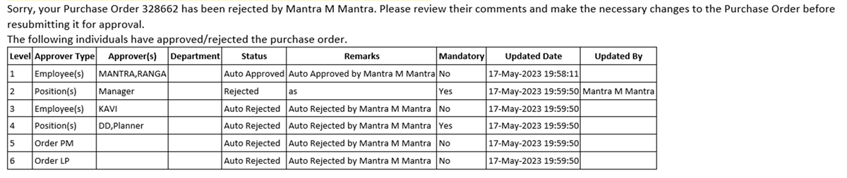 What happens when any of the level approvers Approves/ Rejects the PO, is explains in the sections below.