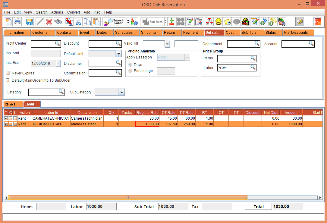 Figure14.0 Labor Price Group [PG#1] tagged to the Rental Reservation Order [ORD-246] from the Default tab