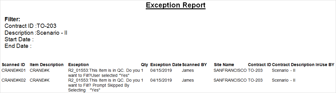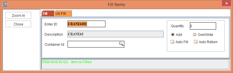 The system does not display any prompts with messages, as the "Apply this setting to all future scans in this session" check box was selected during the scan of the Asset [CRANE#J01]. Hence, while scanning the Asset [CRANE#J02] in the same session, the system displays the Fill Items dialog box Status bar message "ITEM WAS IN QC. Item is Filled," as shown in Figure 1.5.