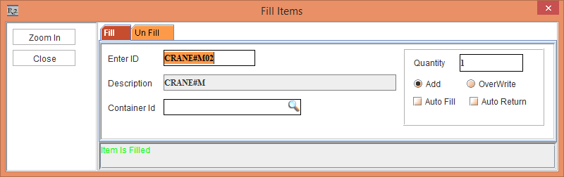 The system does not display any prompts with messages, as the "Skip this prompt for all the Assets scanned during this session" check box was selected during the scan of the Asset [CRANE#N01]. Hence, while scanning the Asset [CRANE#N02] in the same session, the system displays the Fill Items dialog box Status bar message "Item is Filled"