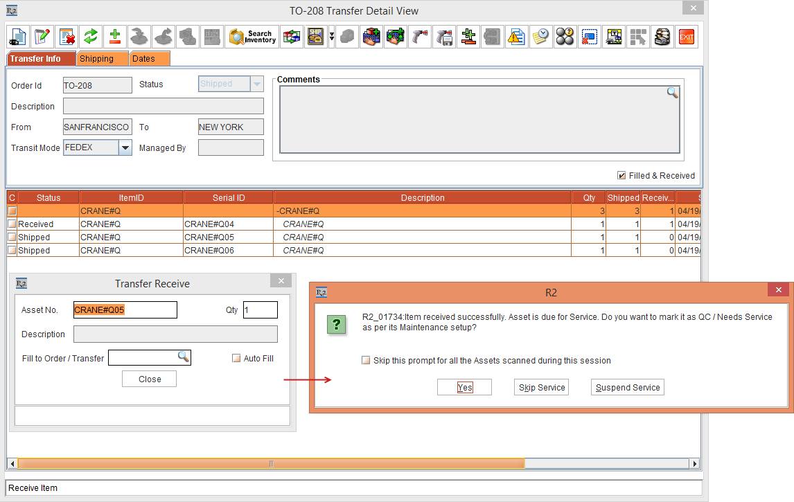 The Status of the Item [CRANE#Q] is modified to Filled in the Transfer Order [TO-208] and the Status of the Assets [CRANE#O03] and [CRANE#O04] will be modified to In Transfer.