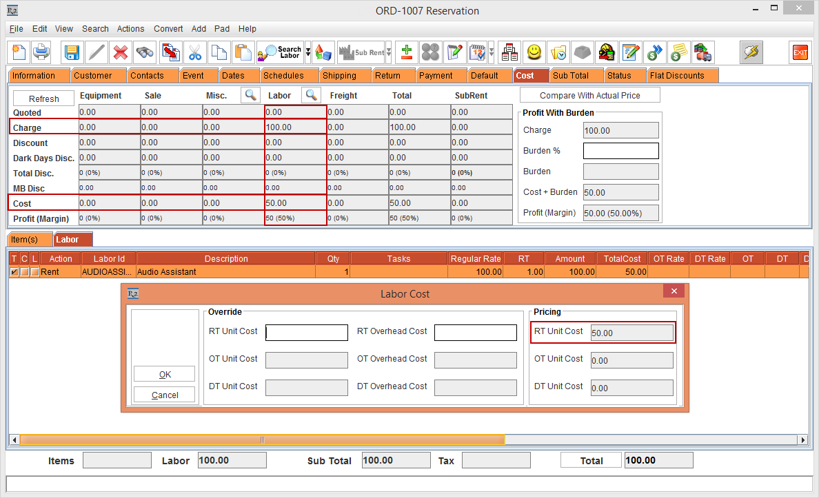 Figure 3.1 Order [ORD-1006] > Cost tab and Labor Cost window