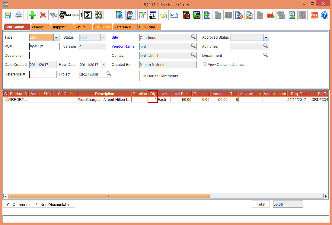 From the Rental Reservation Order [ORD-3340], right-click the Item and select the option Open PO. The Misc Purchase Order is displayed, as shown in the Figure 1.4.