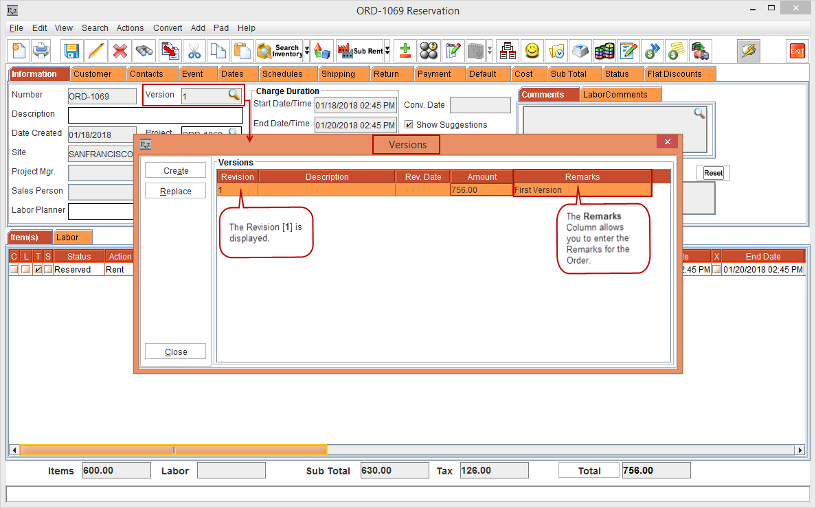 Figure 1.0 Rental Order Quote [ORDER-1069] with the Version [1] details