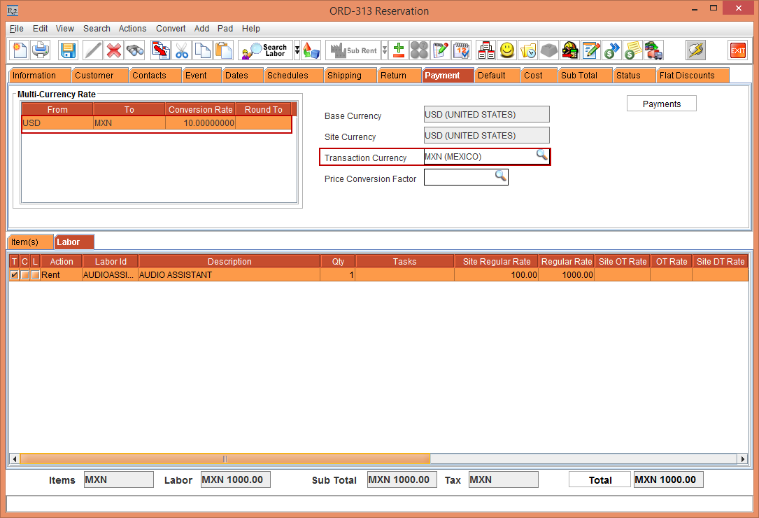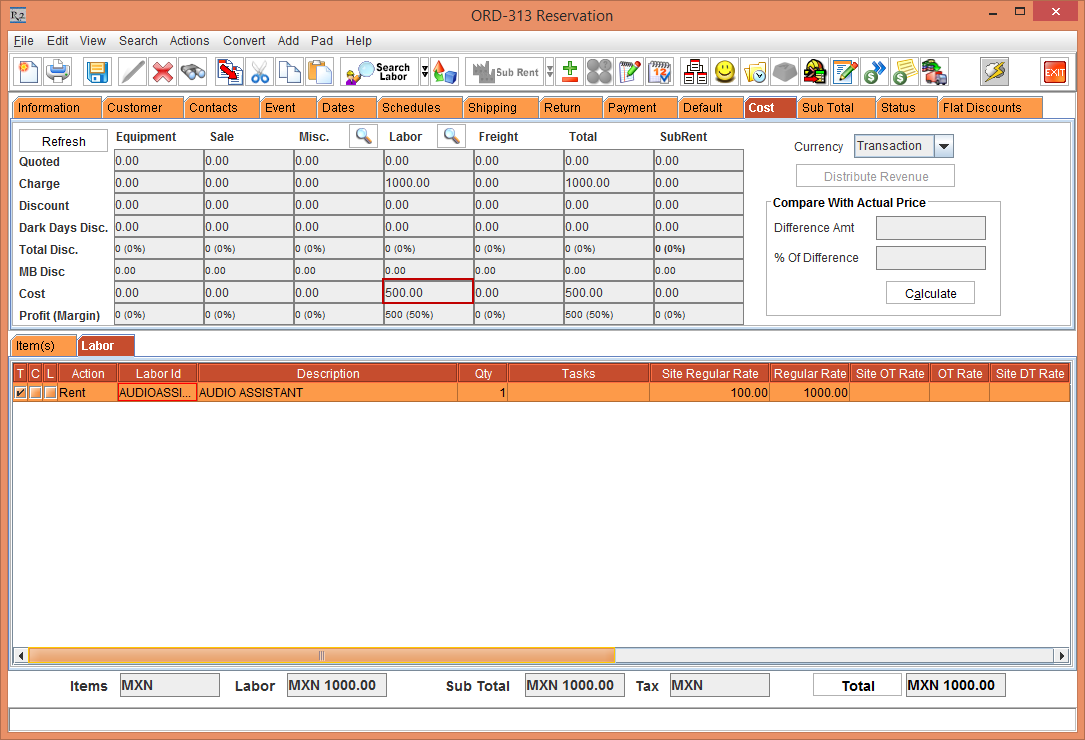 Create a Rental Reservation Order [ORD-312] add the Labor [AUDIOASSIST] to the Order, as shown in Figure 1.0.