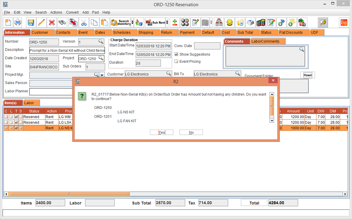 Figure 1.0 Rental Reservation Order [ORD-1250] with the Serial Items and Non-Serial Kit