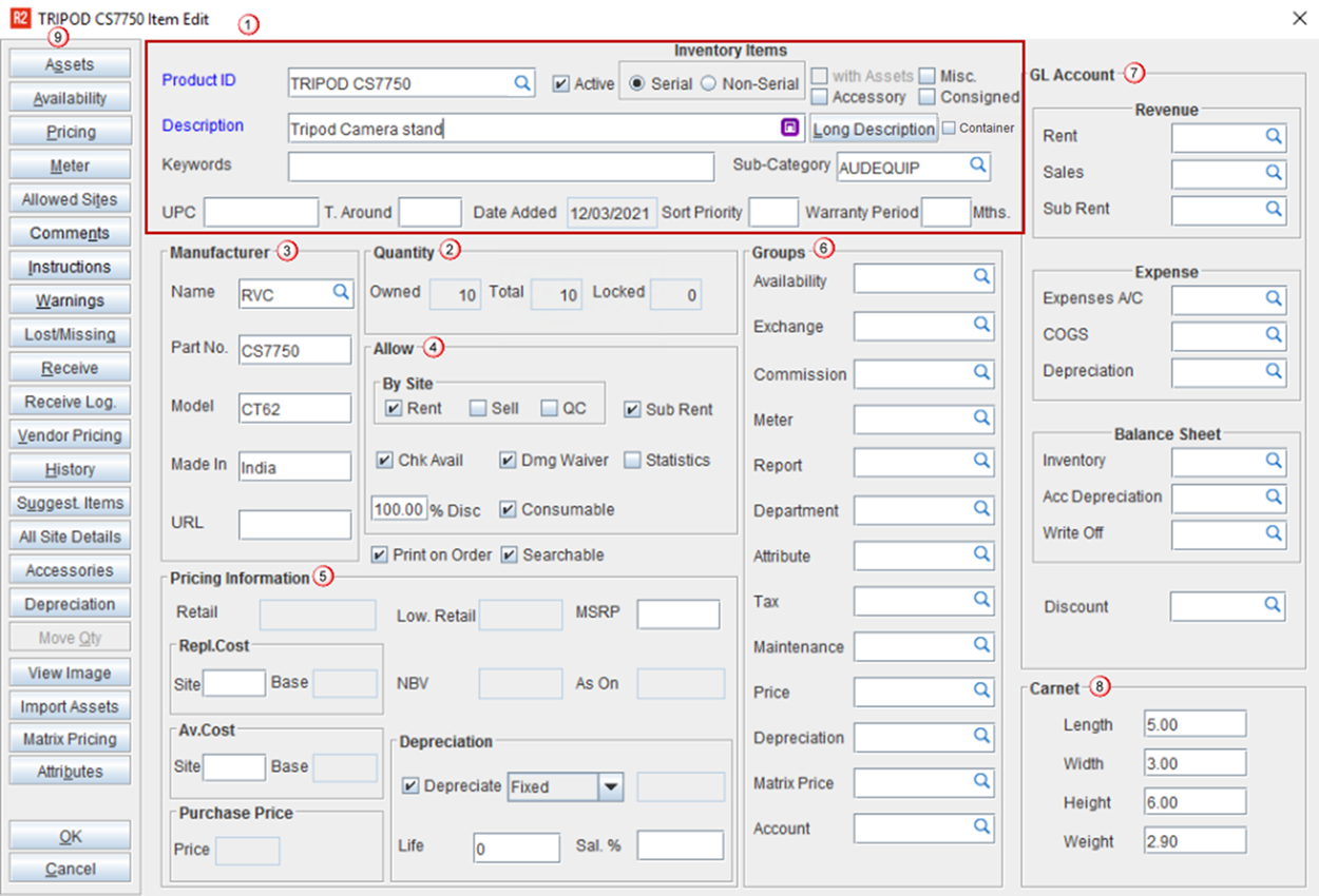 Sub Rent | Determines whether the item can be a sub rental. Also, you can set the same item as Rent, Sell or Sub-Rent for different sites |