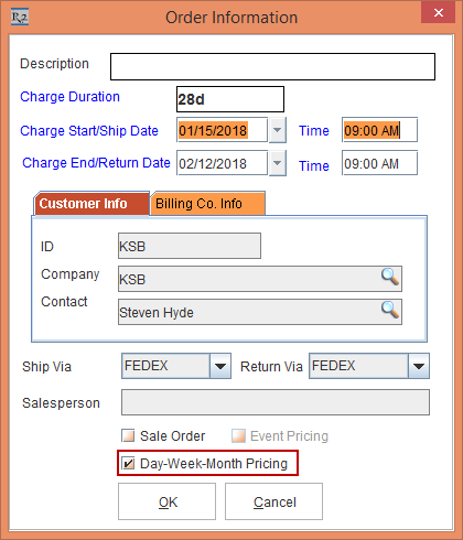 When the Day-Week-Month Pricing check box is enabled in the Configuration module, that is reflected or defaulted in the Order in Formation window. If the Day-Week-Month Pricing check box is not enabled in the Configuration module, you can enable or disable it by selecting the Day-Week-Month Pricing check box in the Order in Formation window.