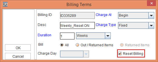 The Reset Billing check box in Billing Terms dialog is available for both Day-Week-Month Pricing selected and when Day-Week-Month Pricing is not selected in Orders.