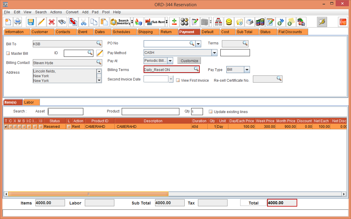 Create a Rental Reservation Order [ORD-344] from 15-Jan-2018 for 40 Days. observe that the Day/Each Price, Week Price and Month Price are fetched from the Pricing definition provided in the Item.