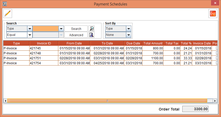 Select the View menu > Payment Schedules option. The Payment Schedules window is displayed. Observe the Invoices generated in Figure 4.32. There are 4 separate Invoices generated.