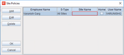 Click the importable button in the Site Name field to display the Sites window. Select a site from the list displayed in this window. This is a mandatory field if the Home check box is not selected or if S-Type is not equal to All Sites.