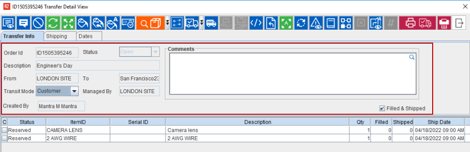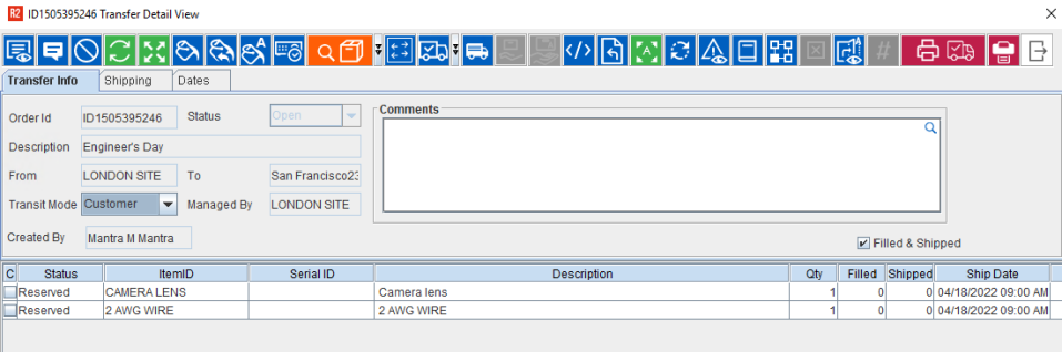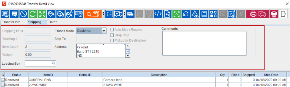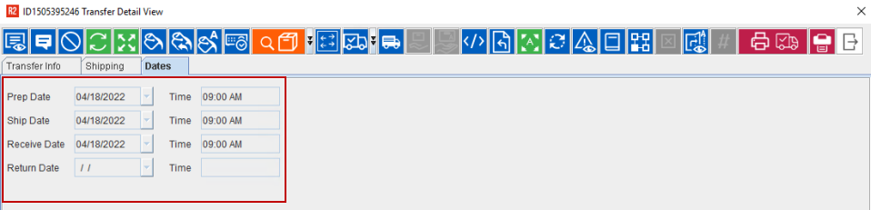 The Dates tab is used to establish the Transfer order's processing time-frame and all the fields here are non-editable.