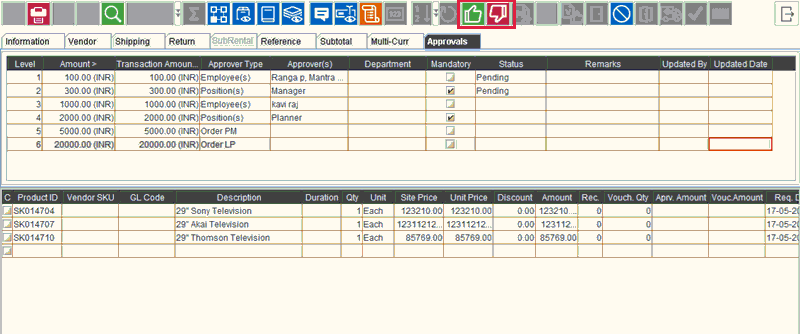 What happens when any of the level approvers Approves/ Rejects the PO, is explains in the sections below.