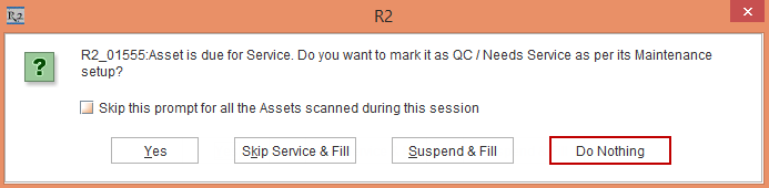 When an Asset is due for Service and a prompt is displayed while filling an Asset having Schedules expired. A new button Do Nothing is added to perform no Asset filling. This is, as shown in the Figure 3.1.