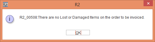 3. The system displays a prompt with the message "R2_00508: There are no Lost or Damaged Items on the order to be invoiced." with OK button, as shown in Figure 2.12.