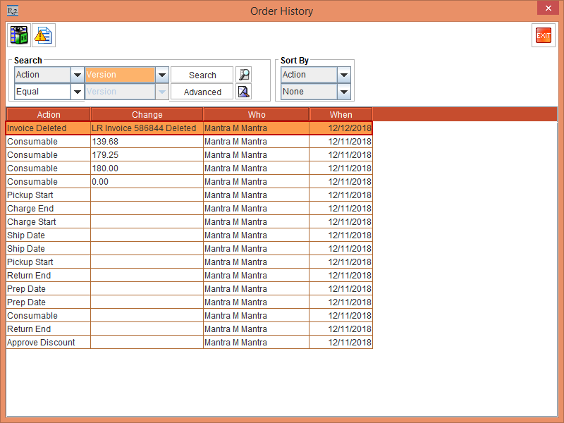 Figure 2.14 Order History displaying the Action [Invoice Deleted] with the Change [LR Invoice 586844 Deleted]