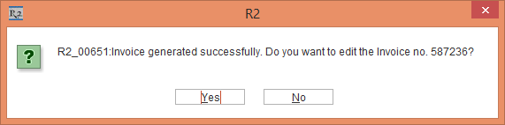 6. Click the Generate Invoices button displaying a prompt with the message "R2_00651: Invoice generated successfully. Do you want to edit the Invoice no. 587236?," as shown in Figure 2.15.