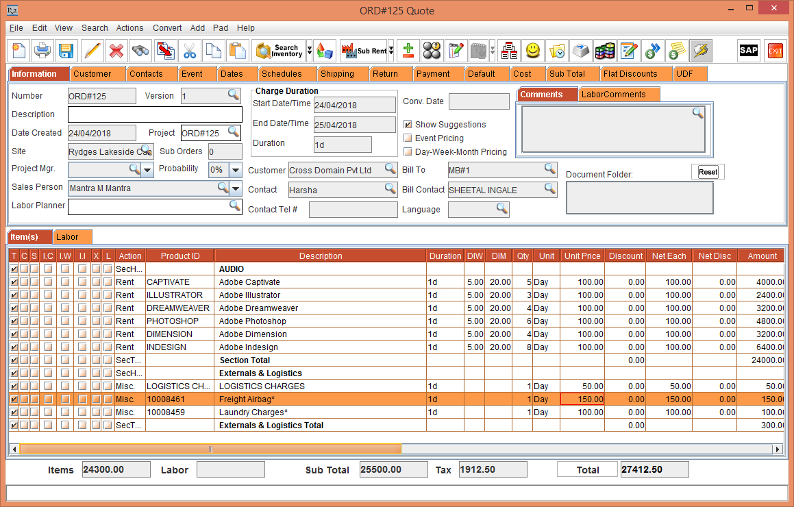 Figure 1.1 Rental Order Quote [ORD#123] with Labor Positions