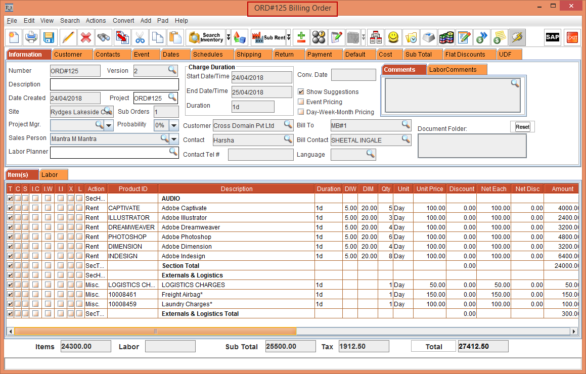 1. Select Convert > Billing Order and convert the Quote to Billing Order by carrying all the Items from the Quote to Billing Order as explained in Quote Confirmation Work Flow. Quote [ORD#125] will be converted to Billing Order , as shown in Figure 3.1 and an Operation Order [ORD#125.01] will be created , as shown in Figure 3.2.