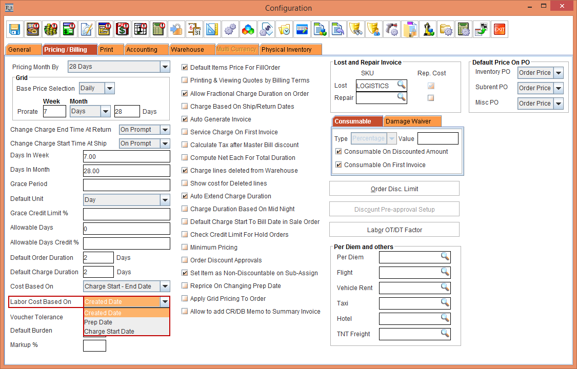 Now, support has been provided to populate the Labor Cost either based on the Created Date or Prep Date or Charge Start Date. The settings for this is provided in the Configuration module > Pricing / Billing tab > Labor Cost Based On drop-down > Created Date, Prep Date, Charge Start Date options, as shown in Figure 1.0.