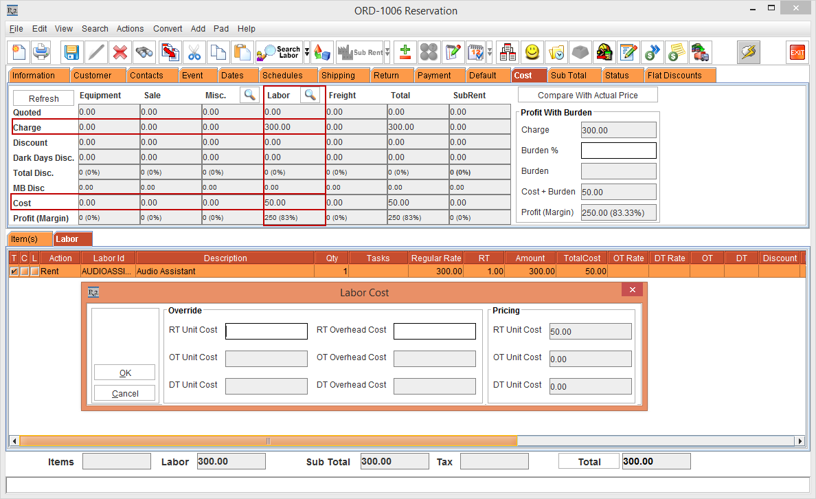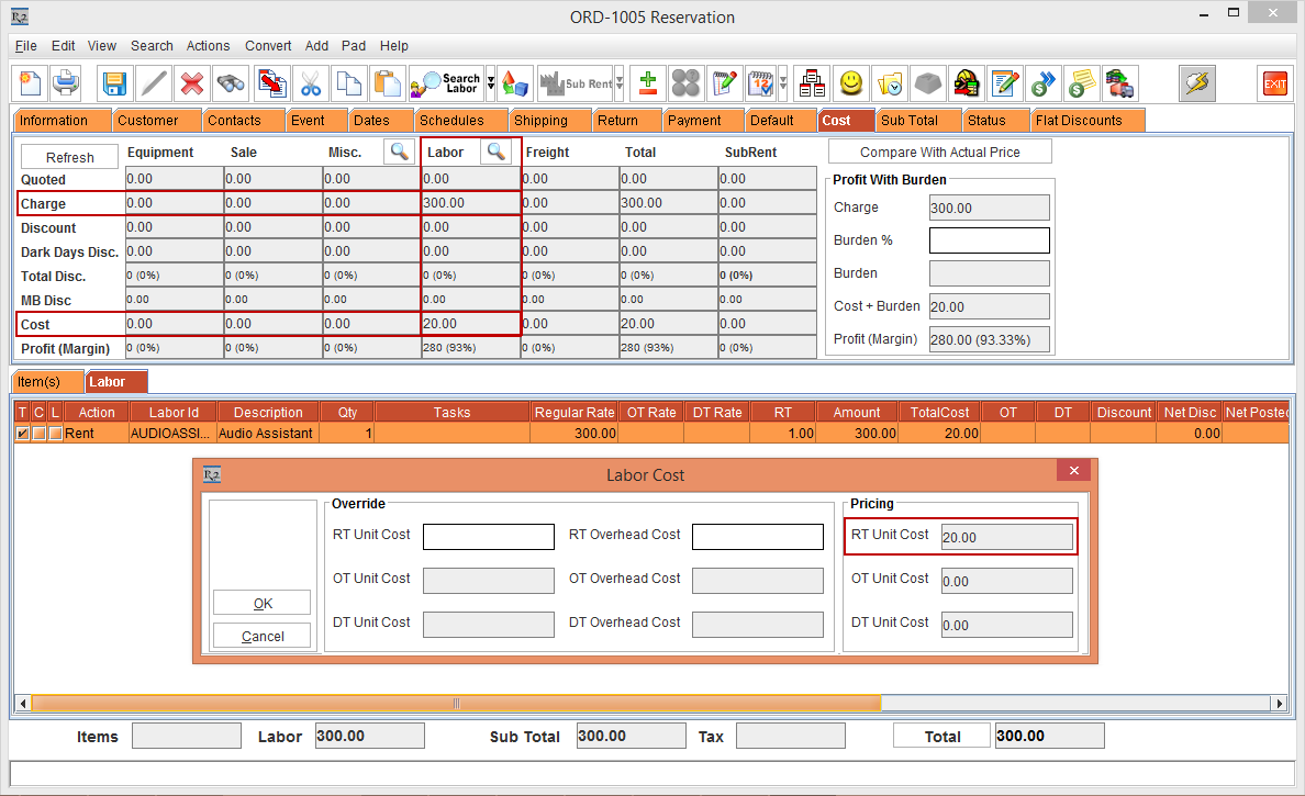 Figure 3.1 Order [ORD-1006] > Cost tab and Labor Cost window