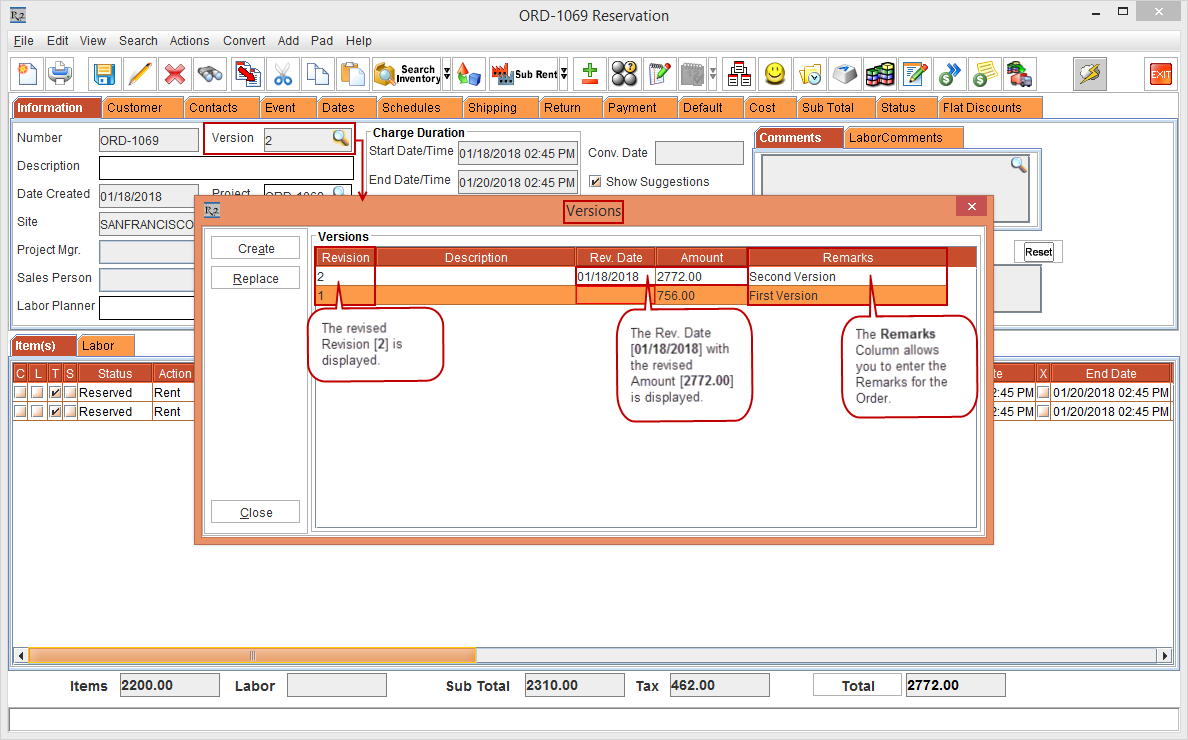 Figure1.1 Rental Order Quote [ORDER-1069] with the updated Version [2] details