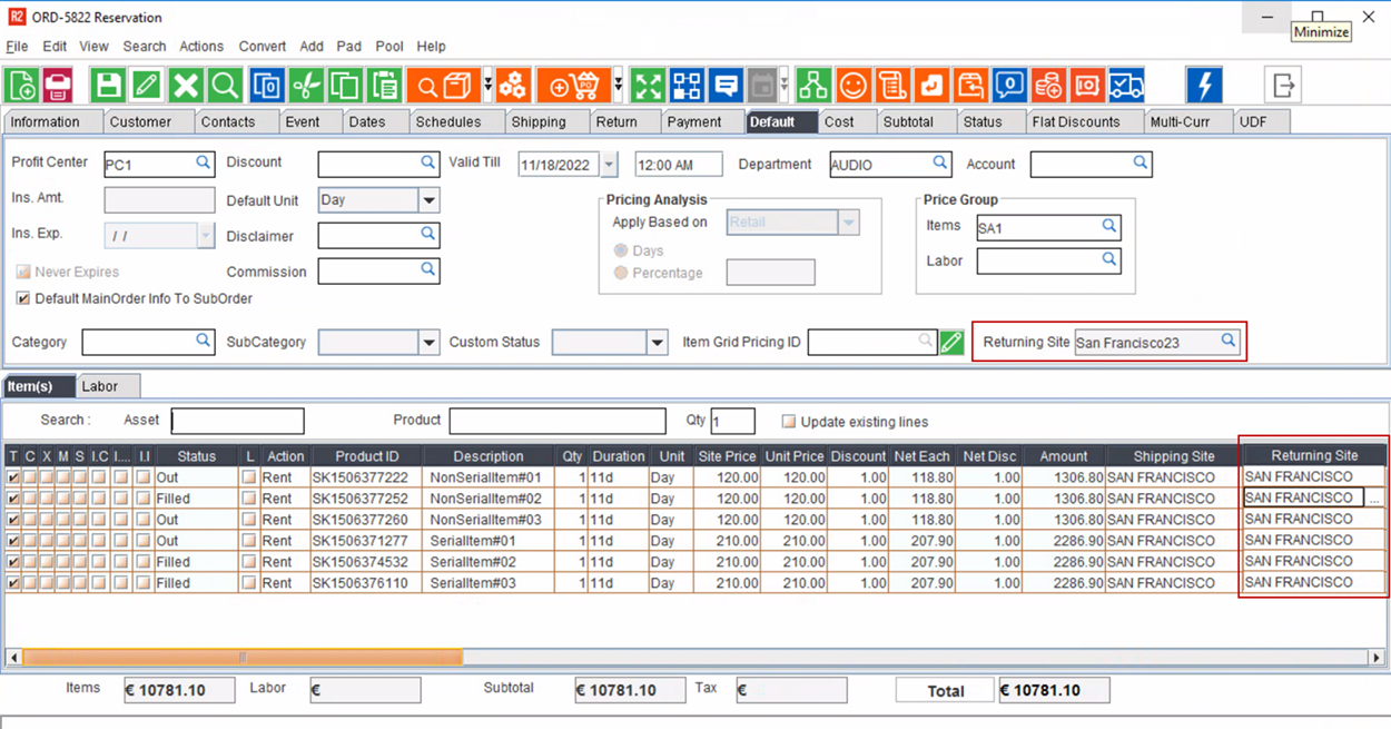 Created a rental order with few items. Initially both Shipping and Returning Site is San Francisco.
