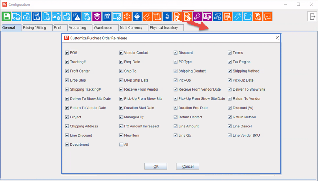 These settings can be done in the Configuration Module. And 'Only the fields selected in this settings' will be considered when R2 validates if a PO was modified or not.