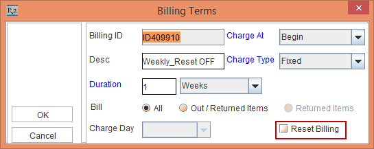 The Reset Billing check box in Billing Terms dialog is available for both Day-Week-Month Pricing selected and when Day-Week-Month Pricing is not selected in Orders.