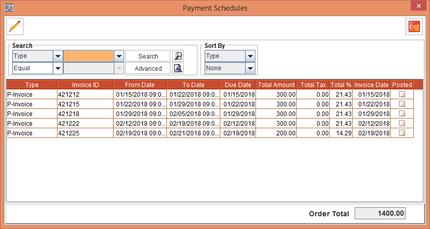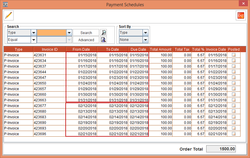 Select the View menu > Payment Schedules option. The Payment Schedules window is displayed. There will be 40 separate Invoices generated for 40 days separately as the Billing is Daily and Reset Billing check box is selected. This is, as shown in the Figure 2.3.