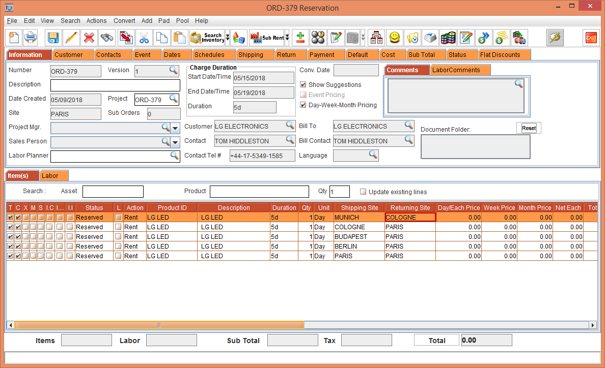1. In the Rental Reservation Order [ORD-379], the Shipping Sites for each of the Item line is displayed as [PARIS], [BERLIN], [BUDAPEST], [COLOGNE], and [MUNICH] with the Order Site as the Returning Site [PARIS] and the Status modified to Reserved, as shown in Figure above.