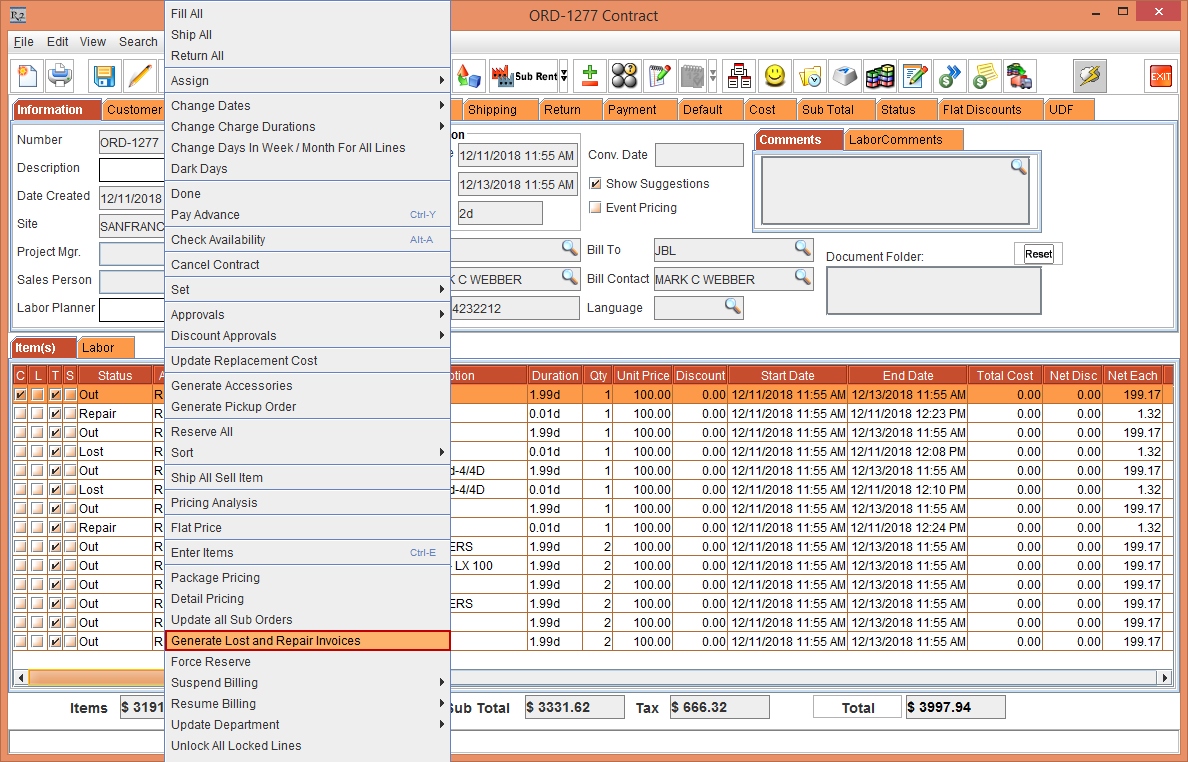2. In the Order [ORD-1277] window, select the Actions menu and select the Generate Lost and Repair Invoices option.