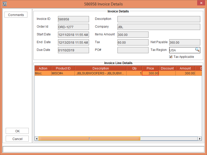 2. The system will not update the initially generated Invoice [586844]  and generates a new Open Lost and Repair Invoice for the Serial Item [JBLSUBWOOFERS] with Lost Status as 586958 Invoices Details window is generated and is displayed, as shown in Figure 2.9.