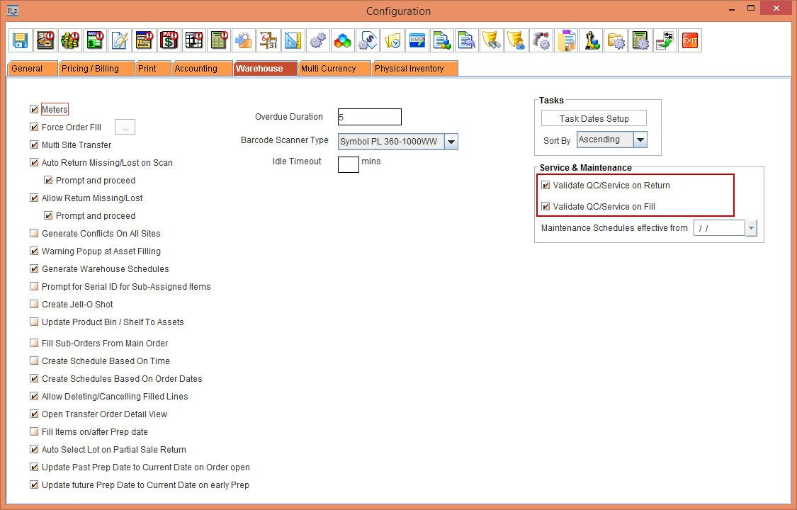 Select the Warehouse tab > select the check boxes Validate QC/Service on Return and Validate QC/Service on Fill, shown in Figure 2.0.