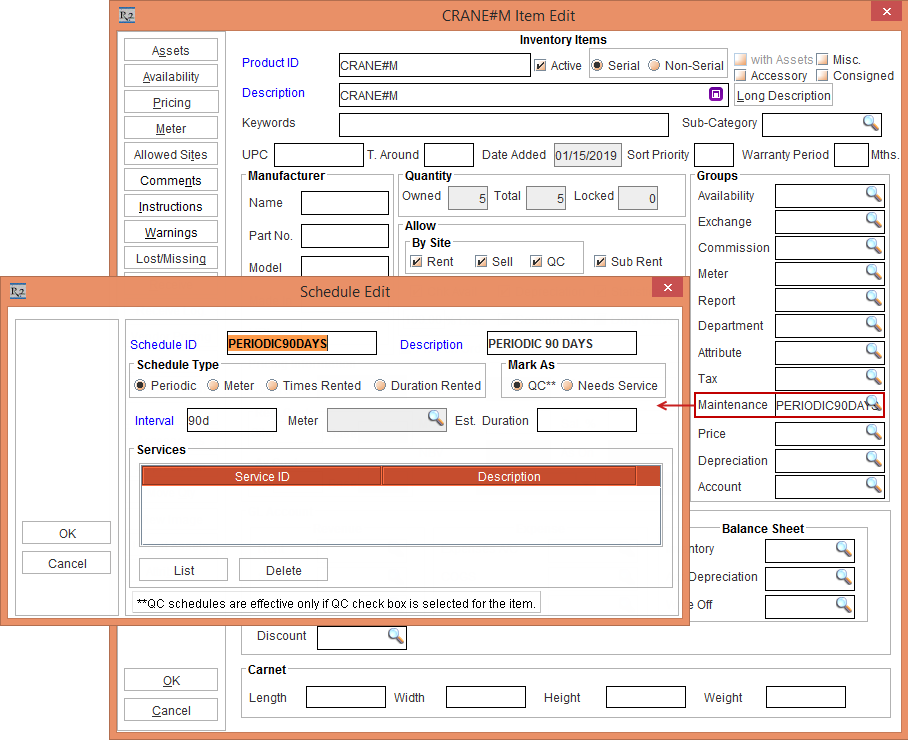 Tag Maintenance Group [PERIODIC90DAYS] with Maintenance Schedule Periodic 90Days to Item [CRANE#K], as shown in Figure 3.1.