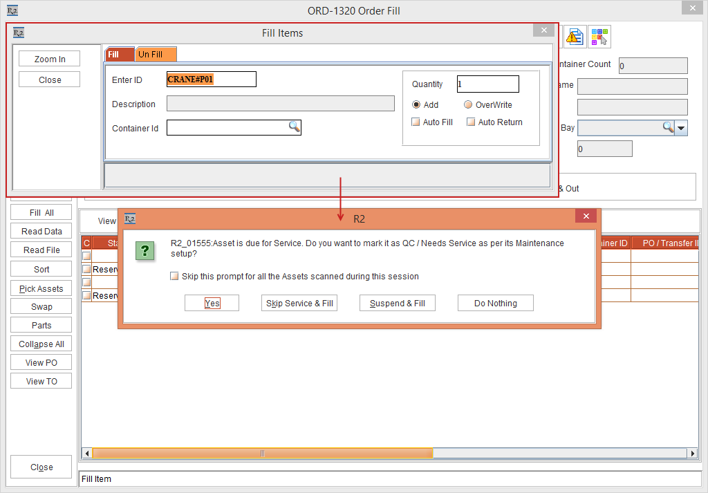 On the Date [17-April- 2019] open the Prep Task of [ORD-1321] and scan the Asset [CRANE#Q01] to fill it. The system displays the message, “R2_10555:Asset is due for Service. Do you want to mark it as QC / Needs Service as per its Maintenance setup?” with "Skip this prompt for all the Assets scanned during this session" check box and Yes, Skip Service & Fill, Suspend & Fill, and Do Nothing buttons.