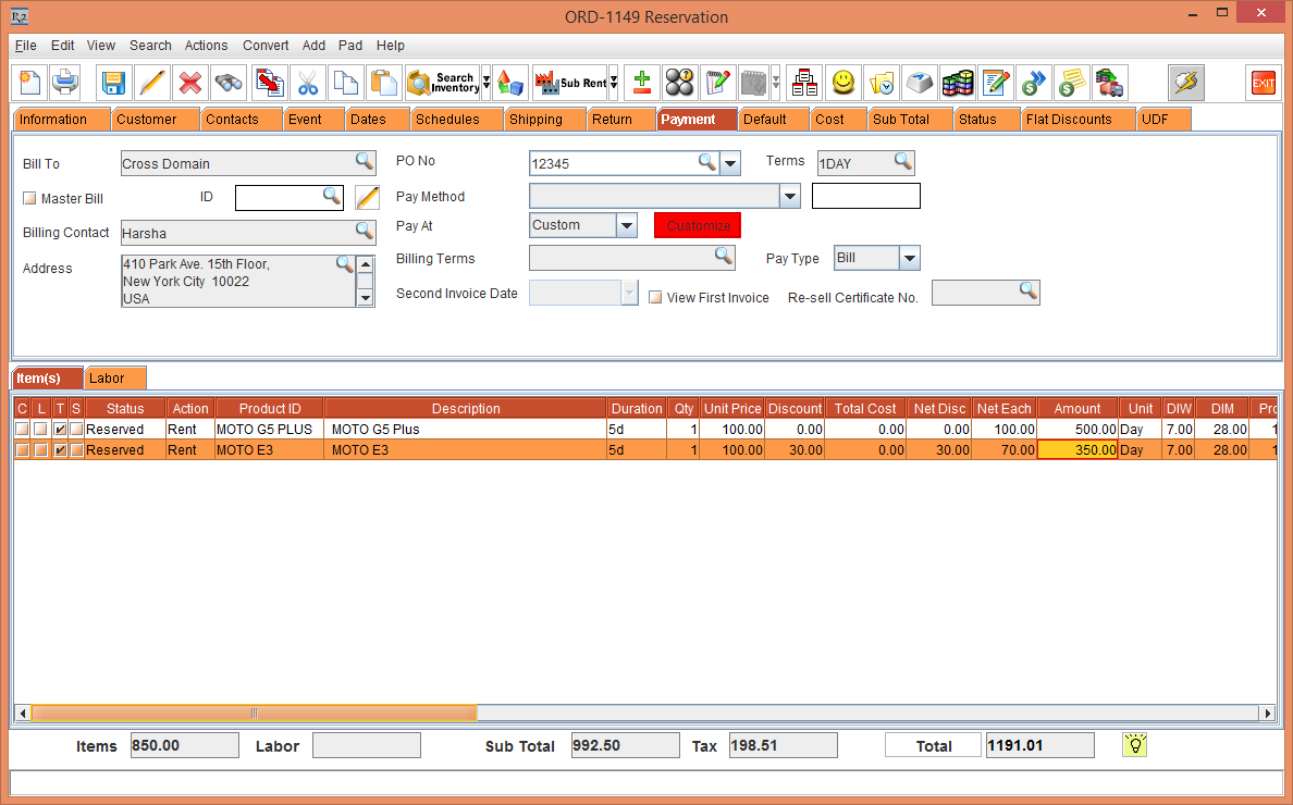 2. Create an Order [ORD-1149] > add the Items [MOTO E3] and [MOTO G5 PLUS] with Unit Price as 100, as shown in Figure 1.0.