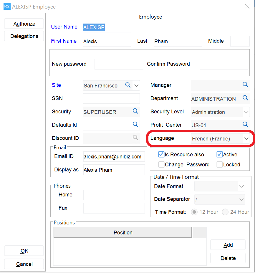 The user will be able to define a default language for an employee from within Employee edit window (as displayed below).