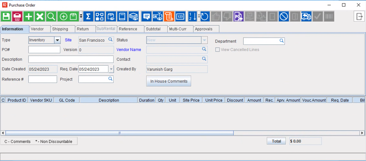Once you have completed the above steps, a New Purchase Order window is displayed.