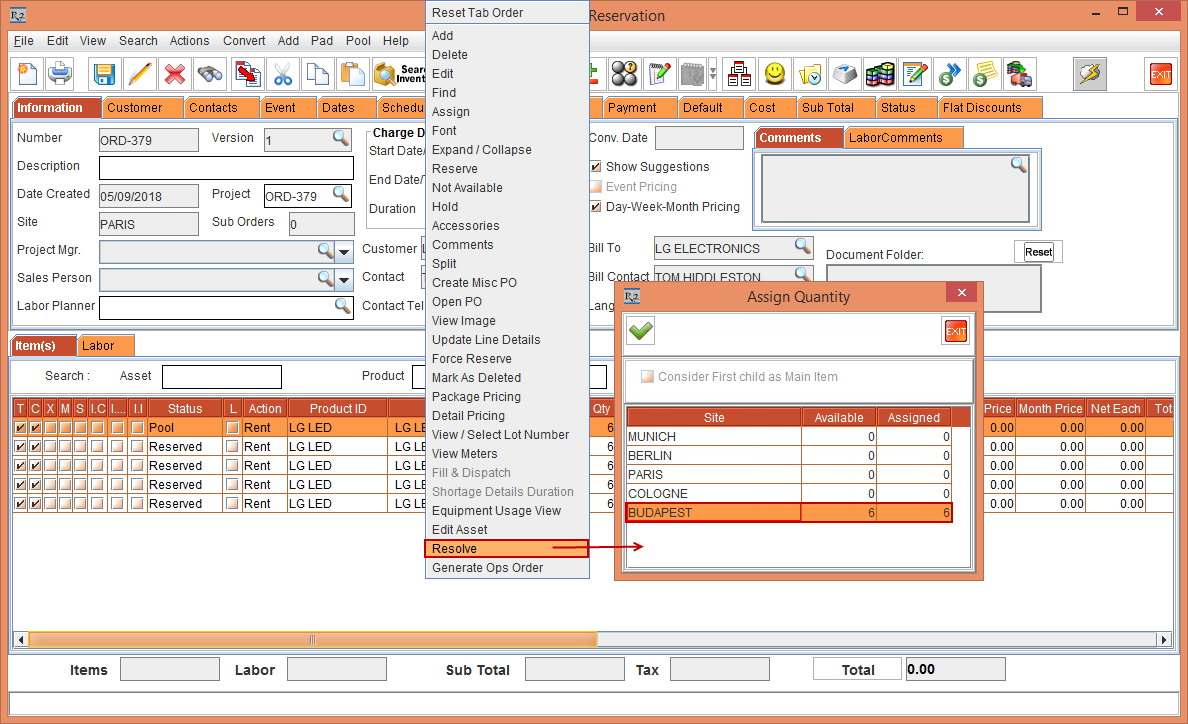 6. Select the Item line [LG LED] > right-click the > Resolve option. The Assign Quantity window is displayed with the stock Available at the Sites [BERLIN], [BUDAPEST], and [PARIS].