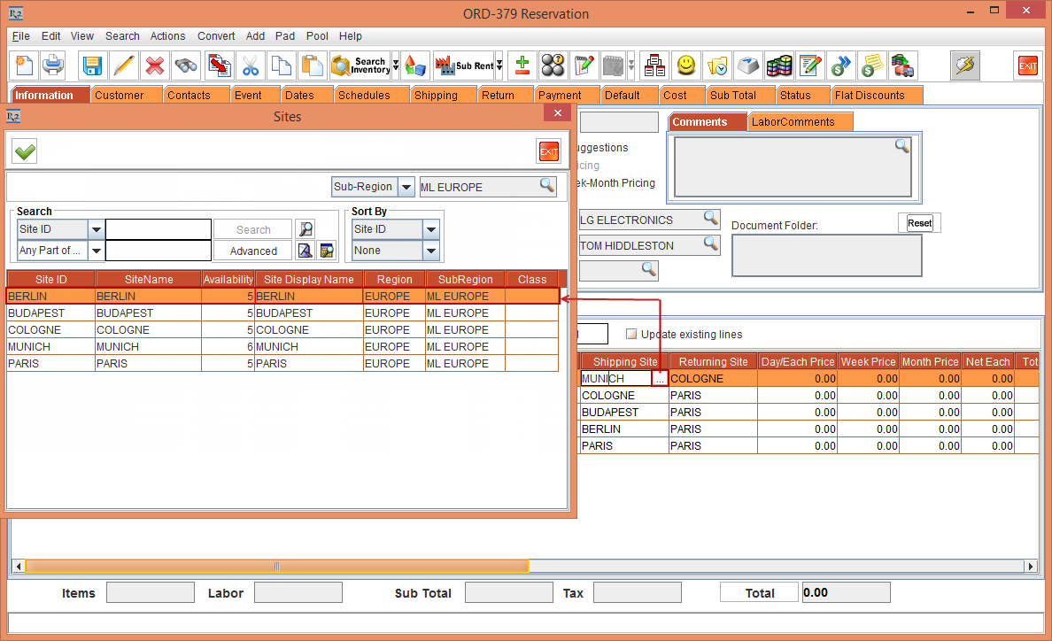 The Shipping Site and the Returning Site is displayed as [ML EUROPE] which is the Sub-Region ID, due to the Cutoff time in days [3] in the Sub-Region window.